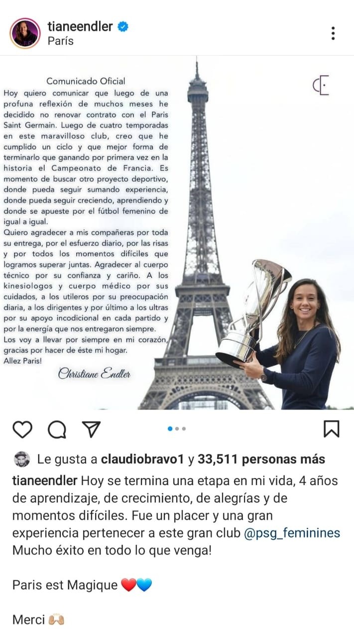 Christiane Endler, portera de la Selección Chilena y hasta el día de hoy del PSG francés, anunció mediante sus Redes Sociales que no seguirá en el club parisino en la temporada que se avecina en Europa.