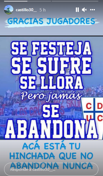 Castillo además publicó un afiche: “Se festeja, se sufre, se llora, pero jamás se abandona”, dice la imagen con la hinchada de fondo.