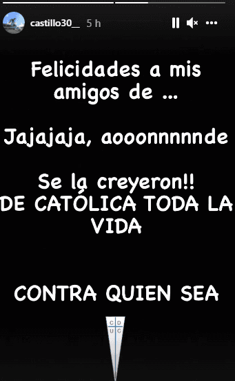 El atacante escribió a través de sus historias de Instagram: “Felicidades a mis amigos de… jajaja adonde. Se la creyeron, de Católica toda la vida, contra quien sea”.