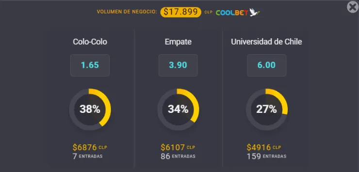 Para el OSO de Coolbet, el gran favorito para ganar el Superclásico chileno es Colo Colo, que paga 1.65 veces lo que juegues, por sobre los 6.00 que paga Universidad de Chile, si crees que termina en victoria azul. Ahora, si piensas que termina en empate, paga 3.90 veces lo que apuestes.