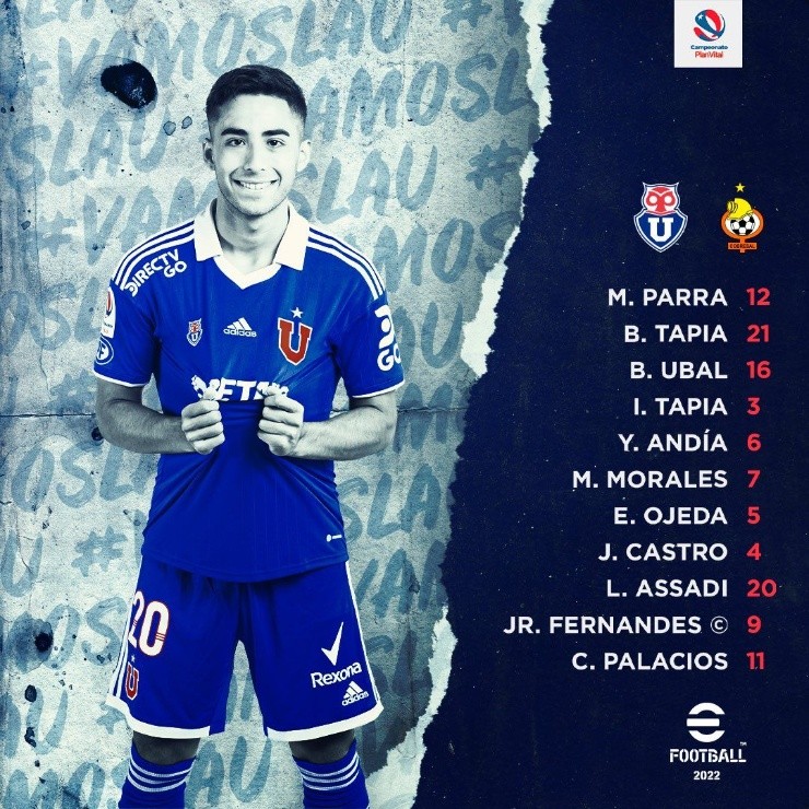 De esta manera, la formación de Universidad de Chile será con Martín Parra en el arco; Bastián Tapia, Bastián Ubal e Ignacio Tapia en defensa; Yonathan Andía, Mauricio Morales, Emmanuel Ojeda, José Castro y Lucas Assadi en el mediocampo; Cristián Palacios y Junior Fernandes en la delantera.