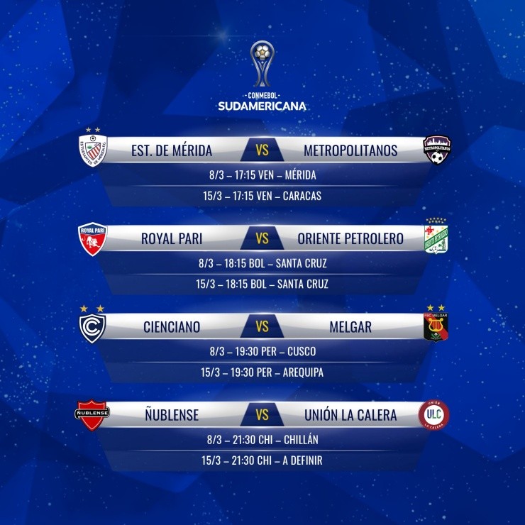 En esta parte del certamen son cuatro los clubes chilenos que dirán presente en esta primera llave de partidos ida y vuelta. Instancia por la cual durante la jornada de ayer se emparejaron los enfrentamientos y quedaron definidos con duelos entre Ñublense y Unión La Calera, además de Unión Española con Deportes Antofagasta.