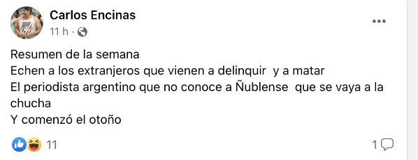 “Echen a los extranjeros que vienen a delinquir y a matar”, dijo también en la misma publicación que apunta a Carrozza por el tema de Ñublense.