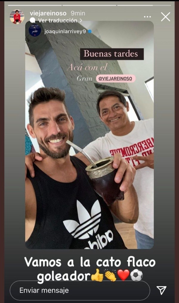 Esta vez el suegro del argentino reposteó una historia de Instagram, donde aparecía junto a Larrivey tomando mate y escribió:”Vamos a la Cato, flaco goleador”.