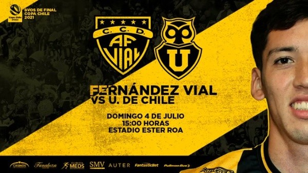 Por el duelo de vuelta de los octavos de final de la Copa Chile, Fernández Vial recibe a su similar de la Universidad de Chile en un cotejo que se jugará este domingo 4 de julio. El encuentro será transmitido EN VIVO Y EN DIRECTO a través de la pantalla de TNT Sports HD, TNT Sports 2, Estadio TNT Sports.