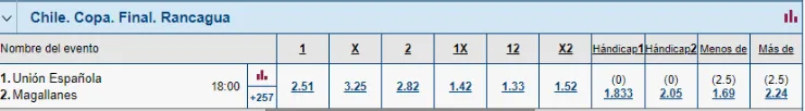 En Marathonbet tienes cientos de opciones para jugar en esta gran final de la Copa Chile 2022. De hecho, ya se anticipa que el favorito para ganar la cita en Rancagua es Unión Española, que paga 1,81 veces lo que juegues si crees que el cuadro hispano levanta el trofeo. Pero, si crees que Magallanes será el vencedor de la Copa Chile, este resultado paga 1,952 veces lo que apuestes.