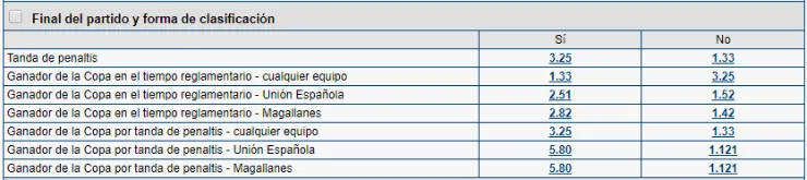 También te la puedes jugar junto a Marathonbet por como terminará el partido en el estadio El Teniente de Rancagua: Si crees que será por penales, tras los 90 minutos, paga 3,25 veces lo que juegues si piensas que así sera; mientras que si piensas que esto no ocurrirá, paga 1,33 veces lo que apuestes.