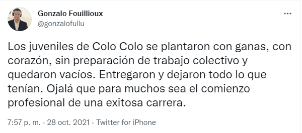 Una instancia por la cual hizo el periodista nacional Gonzalo Fouillioux a través de sus redes sociales, quien se desató en elogios a los jugadores que saltaron a la cancha con la camiseta de Colo Colo y que cometieron un gran compromiso a pesar del resultado.