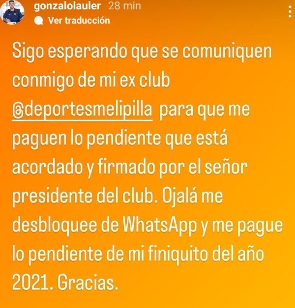 Mediante una historia, Lauler fue directo y contó que “sigo esperando que se comuniquen conmigo de mi ex club Deportes Melipilla,para que me paguen lo pendiente que está acordado y firmado por el señor presidente del club”.