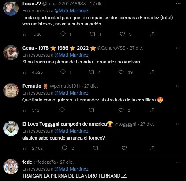 La cuenta en Twitter @GenaroVSS publicó “si no traen la pierna de Leandro Fernández no vuelvan“, a lo que un hincha de la U aprovechó la instancia de preguntar el motivo del odio hacia el jugador, es ahí donde le realizaron un minucioso desglose.