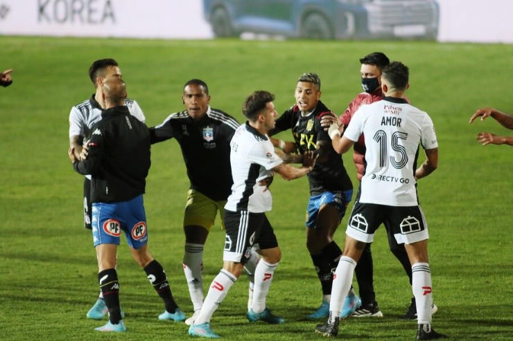 Cuando el partido ya expiraba y el Cacique buscaba desesperadamente el gol que les diera la igualdad -el cual encontraron, pero el VAR en una cuestionable línea concluyó en que estaba fuera de juego- se armó una pelea en la banca de Unión Española entre Benjamín Galdames y César Fuentes, la cual terminó con el futbolista mexicano expulsado.