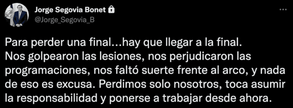 “Para perder una final hay que llegar a la final. Nos golpearon las lesiones, nos perjudicaron las programaciones, nos faltó suerte frente al arco, y nada de eso es excusa”, escribió Segovia en su Twitter personal.