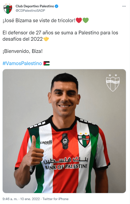 “José Bizama se viste de tricolor. El defensor de 27 se suma a Palestino para los desafíos del 2022”, fue el mensaje que el entregaron en el club árabe con el que de dieron la bienvenida en su regreso al fútbol chileno.