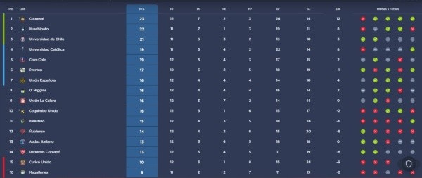 Esto, conlleva que los mineros son los nuevos líderes del certamen con 23 puntos, dejando a Huachipato como segundo con 22 y la U en el tercer puesto con 21, entendiendo que tanto los acereros como los laicos, tienen pendientes sus compromisos de la duodécima fecha.