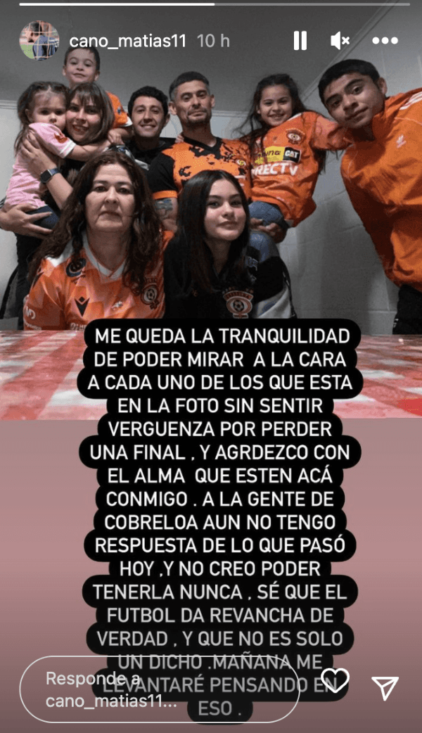 Por ello, Cano no tuvo palabras y, de inmediato, colgó una foto en sus Stories de Instagram, donde dejó en claro que está muy afectado por lo ocurrido y, de paso, aprovechó de apoyarse en sus seres queridos que estaban todos con la camiseta de Cobreloa.
