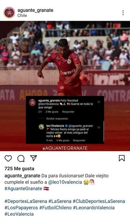 En una publicación de una cuenta partidista de Deportes La Serena, se le deseó una feliz navidad a Valencia, a lo que el jugador respondió con un “Ya pedí al viejito volver al más antiguo del norte”.