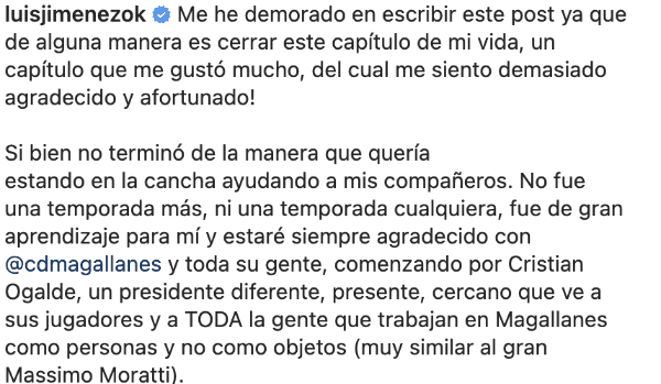 “Estaré siempre agradecido conMagallanes y toda su gente, comenzando por Cristian Ogalde, un presidente diferente, presente, cercano que ve a sus jugadores y a TODA la gente que trabajan en Magallanes como personas y no como objetos (muy similar al gran Massimo Moratti)“, indicó.