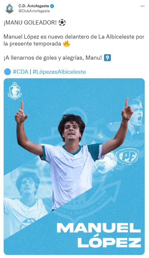 “¡Manu goleador! Manuel López es nuevo delantero de la albiceleste por la presente temporada. ¡A llenarnos de goles y alegrías, Manu!”, le dieron la bienvenida desde la perla del norte al delantero trasandino.