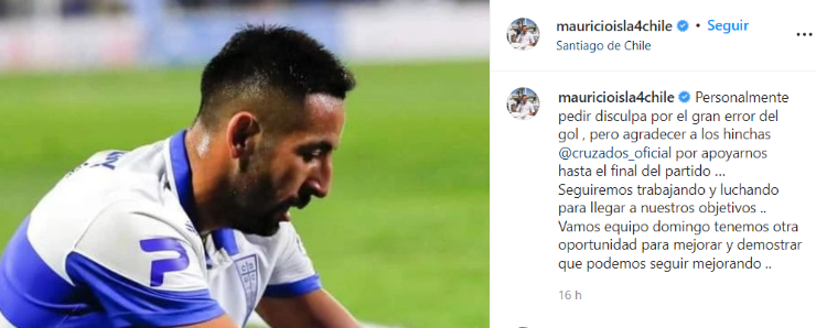 “Personalmente pedir disculpas por el gran error del gol,pero agradecer a los hinchas por apoyarnos hasta el final del partido”, posteó Isla.