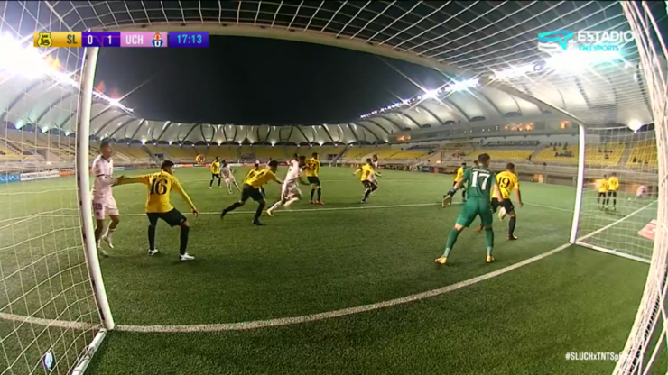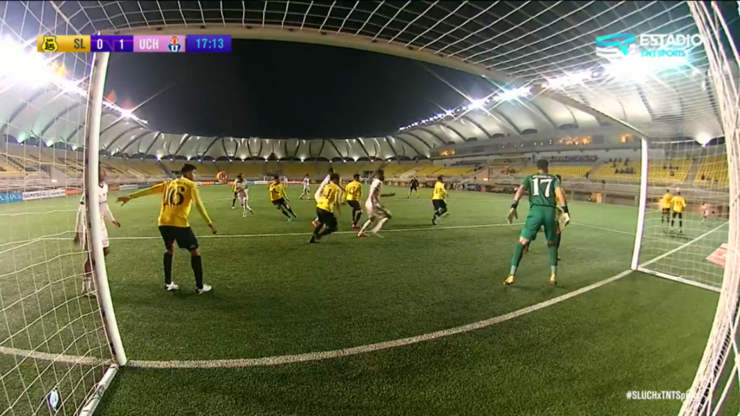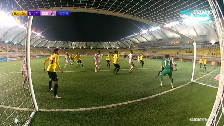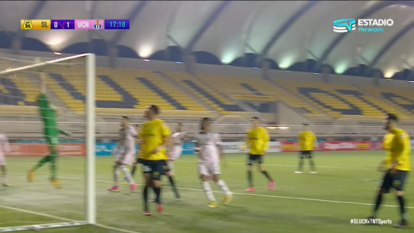 Sandoval le dio un gran efecto al balón, situación que complicó al golero que tenía a 17 jugadores en el área.