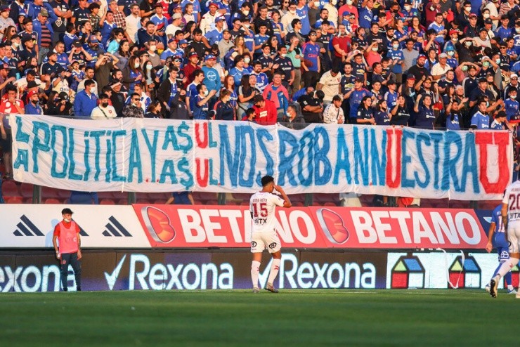 Después, suma: “Durante todo el partido permanecen hinchas de Universidad de Chile sobre la reja de galería sur y andes. En andes se exhiben lienzos contra dirigentes del Club Universidad de Chile”.