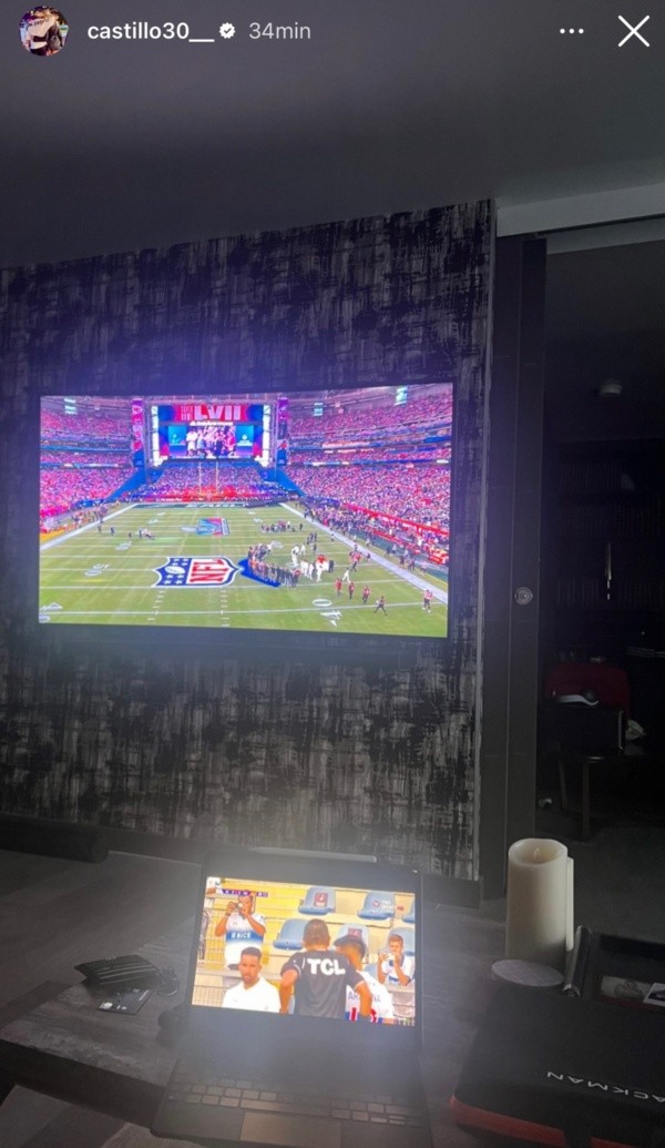 A través de su Instagram, Castillo dejó en claro que no se quería perder ningún detalle del domingo y apareció a dos pantallas viendo la igualdad cruzada y la previa del fútbol americano entre Chiefs y los Eagles, que también paraliza al mundo entero.