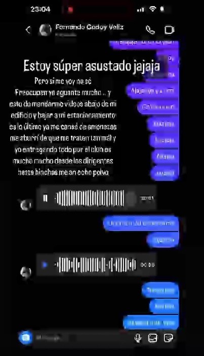Agregando ya más serio que “pero si me voy no sé preocupen, ya aguanté mucho.Y esto de mandarme videos abajo de mi edificio y bajar a mi estacionamiento es lo último. Ya me cansé de amenazas. Me aburrí de que me traten tan mal y yo entregando todo por el club.Es mucho desde los dirigentes hasta hinchas me han hecho polvo”.