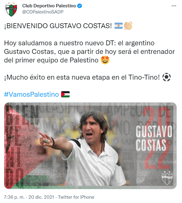 La noticia fue confirmada por el club mediante las redes sociales de la institución de la colonia palestinista. “Hoy saludamos a nuestro nuevo DT: el argentino Gustavo Costas, que a partir de hoy será el entrenador del primer equipo de Palestino”.
