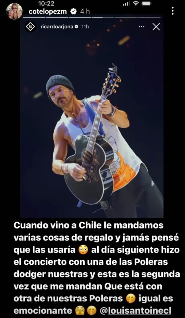 “Cuando vino a Chile le mandamos varias cosas de regalo y jamás pensé que las usaría. Al día siguiente hizo el concierto con una de las poleras dodger nuestras yesta es la segunda vez que me mandan que está con otra de nuestras poleras. Igual es emocionante”, puntualizó López en una historia de su red social.