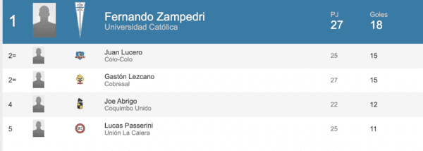 Entre los cinco primeros solo hay un chileno, mientras que el resto de los futbolistas son de Argentina y vienen haciendo lo que mejor saben hacer, goles. El que busca repetir una cosecha goleadora es Fernando Zampedri. El Toro continúa con grandes números en lo personal con la camiseta de la Universidad Católica. El transandino tiene 18 conquistas a lo largo de la temporada.