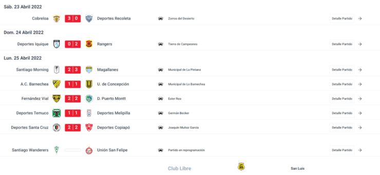 Más al sur, el elenco de Deportes Temuco y Deportes Melipilla terminaron por empatar en el marcador uno a uno en el Germán Becker. Y para cerrar la jornada, Deportes Santa Cruz y Deportes Copiapó igualaron dos a dos en el Joaquín Muñoz García.