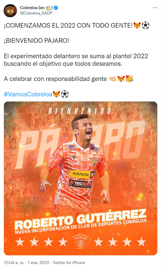 “El experimentado delantero se suma al plantel 2022 buscando el objetivo que todos deseamos”, fue el mensaje que compartieron en el Twitter de Cobreloa para confirmar su fichaje con el club de Calama.