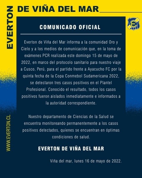 Parte del comunicado del cuadro oro y cielo reza que “En la toma de exámenes PCR realizada este domingo 15 de mayo de 2022, en marco del protocolo sanitario para nuestro viaje a Cusco, Perú, para el partido frente a Ayacucho FC por la quinta fecha de la Copa Conmebol Sudamericana 2022 se detectaron tres casos positivos en el plantel Profesional”.