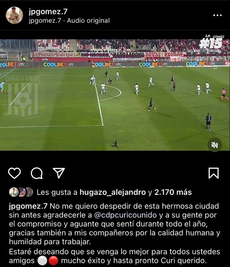 “No me quiero despedir de esta hermosa ciudad sin antes agradecerle a Curicó Unido y a su gente por el compromiso que sentí durante todo el año, gracias también a mis compañeros por la calidad humana y humildad para trabajar”, partió escribiendo el jugador en su Instagram.