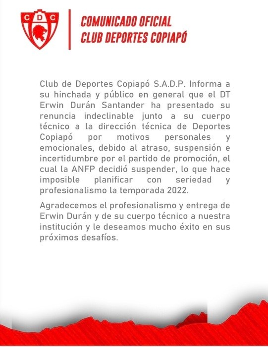 “Erwin Durán Santander ha presentado su renuncia indeclinable junto a su cuerpo técnico a la dirección técnica de Deportes Copiapó por motivos personales y emocionales, debido al atraso, suspensión e incertidumbre por el partido de promoción, el cual la ANFP decidió suspender, lo que hace imposible planificar con seriedad y profesionalismo la temporada 2022”, reza parte del comunicado sobre el ahora ex DT que suena con fuerza para llegar a Deportes Puerto Montt.