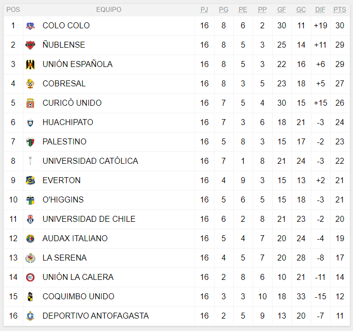 Así queda la tabla de posiciones del Campeonato Nacional al término de la fecha 16.