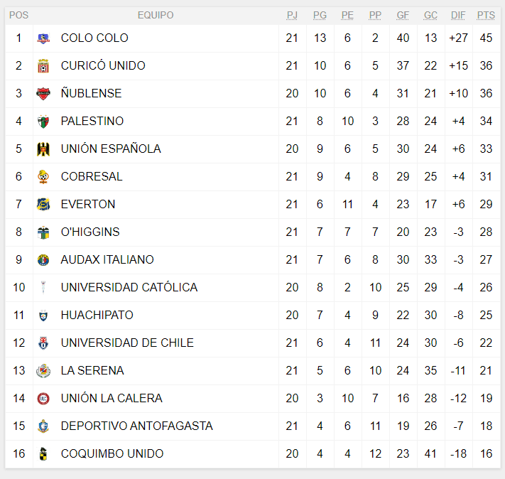 Colo Colo con este triunfo continúa afianzándose en lo más alto del Campeonato Nacional con esta victoria, en la cual se mantiene en la primera posición con una totalidad de 45 puntos sacándose nueve de ventaja a Curicó Unido y Ñublense. Este último, con un partido menos.