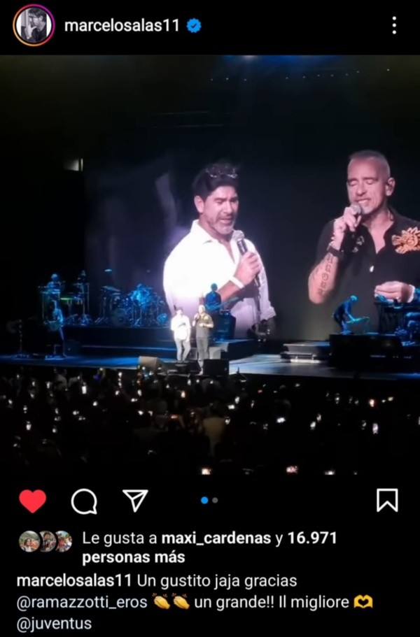El Matador fue al recital que brindó el cantautor italiano Eros Ramazzotti, hincha acérrimo de la Juventus, uno de los dos clubes que defendió Salas en su paso por el país de la bota.