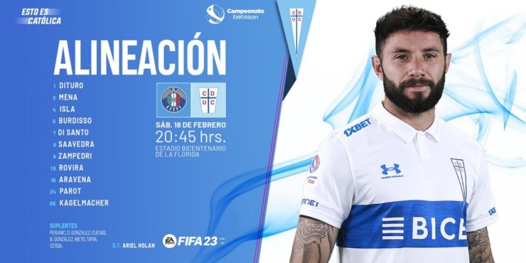 De esta manera, la formación de Universidad Católica será con Matías Dituro en portería: Guillermo Burdisso, Gary Kagelmacher y Alfonso Parot en la defensa; Mauricio Isla, Ignacio Saavedra, Brayan Rovira, Eugenio Mena y Alexander Aravena en el mediocampo; Franco Di Santo y Fernando Zampedri en el ataque.