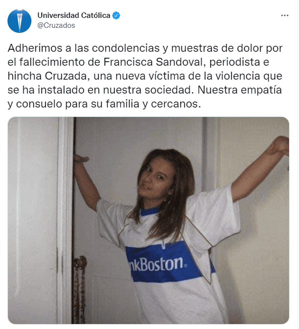 “Adherimos a las condolencias y muestras de dolor por el fallecimiento de Francisca Sandoval, periodista e hincha cruzada, una nueva víctima de la violencia que se ha instalado en nuestra sociedad. Nuestra empatía y consuelo para su familia y cercanos”, escribieron mediante su cuenta de Twitter.