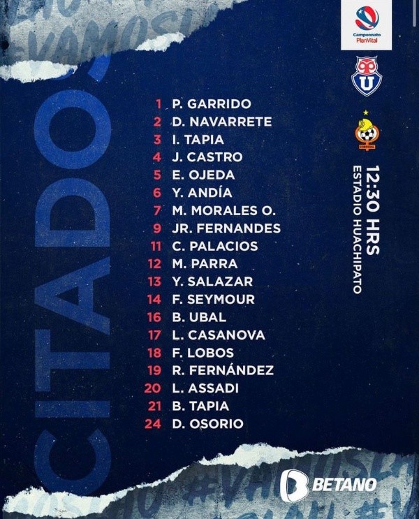Ahondando en las ausencias del equipo Universitario para esta oportunidad, se encuentran las de Pablo Aránguiz, Jeisson Vargas, Marcelo Morales y Cristóbal Campos, este último quien según trascendidos habría tenido un problema familiar, por lo que quedó fuera de la nómina.