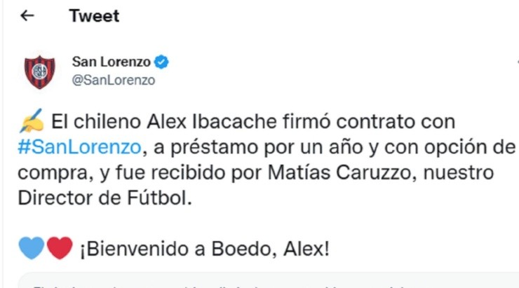 El contrato firmado por el joven de 23 años fue por un año y así lo oficializó el club trasandino a través de sus redes sociales quienes le dejaron un mensaje de bienvenida. “El chileno Alex Ibacache firmó contrato con San Lorenzo a préstamo por un año y con opción de compra, y fue recibido por Matías Curuzzo, nuestro Directo de Fútbol. ¡Bienvenido a Boedo, Alex!” detallaba el mensaje.