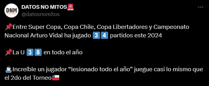“Entre Super Copa, Copa Chile, Copa Libertadores y Campeonato Nacional, Arturo Vidal ha jugado 34 partidos este 2024. La U 38 en todo el año”.