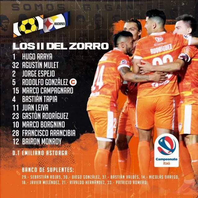 El cuadro zorro va con Hugo Araya en el arco; Jorge Espejo, Rodolfo González, Bastián Tapia y Marco Campagnaro en la zaga; Agustín Mulet, Juan Leiva y Marco Borgnino estarán en el mediocampo; Francisco Arancibia, Gastón Rodríguez y Bairon Monroy en el ataque.