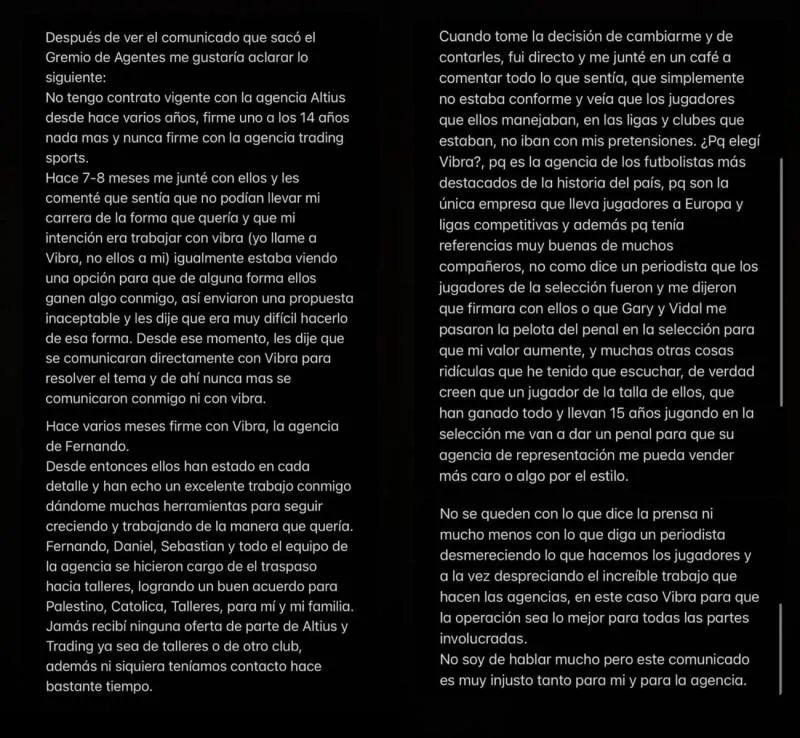 “¿Por qué elegí Vibra? Porque es la agencia de los futbolistas más destacados de la historia del país, pq son la única empresa que lleva jugadores a Europa y ligas competitivas y además porque tenía referencias muy buenas de muchos compañeros”, aseguró.