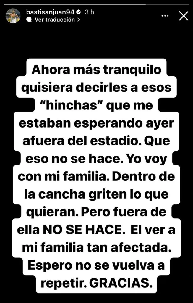 “Ahora más tranquilo quisiera decirles a esos “hinchas” que me estaban esperando ayer afuera en el estadio que eso no se hace, yo voy con mi familia. Dentro del estadio griten lo que quieran, pero fuera de ella no se hace. El ver a mi familia tan afectada. Espero que no se vuelva a repetir. Gracias”, escribió.