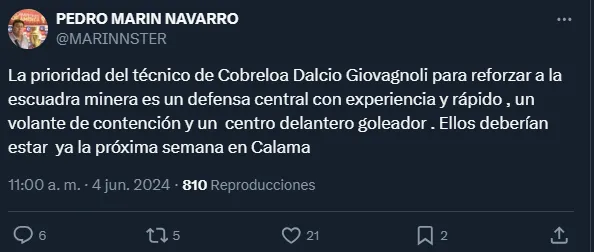 Según informó el periodista, Pedro Marín en su cuenta de ‘X’, el entrenador de Cobreloa le habría solicitado reforzar con extrema urgencia estos tres puestos en el equipo pensando en el próximo semestre: un central, un volante y un centrodelantero.