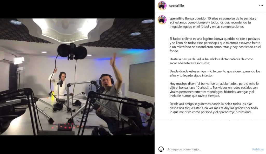 Cristián Peñailillo, discípulo del Gurú en las comunicaciones, le escribió palabras en esta nueva conmemoración de su partida. “Bonva querido! 10 años se cumplen de tu partida y acá estamos como siempre y todos los días recordando tu innegable legado en el fútbol y en las comunicaciones”, redactó el periodista en su cuenta de Instagram.