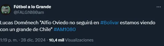 “Alfio Oviedo no seguirá en Bolívar, estamos viendo con un grande de Chile”, fue lo que señaló el representante del atacante de 29 años.
