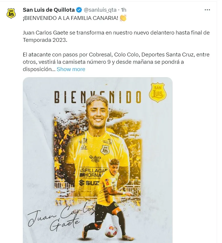 ¡Bienvenido a la familia Canaria! Juan Carlos Gaete se transforma en nuestro nuevo delantero hasta final de Temporada 2023. El atacante con pasos por Cobresal, Colo Colo, Deportes Santa Cruz, entre otros, vestirá la camiseta número 9 y desde mañana se pondrá a disposición de nuestro Director Técnico Francisco Bozán”, informaron en el cuadro de la Quinta Región.
